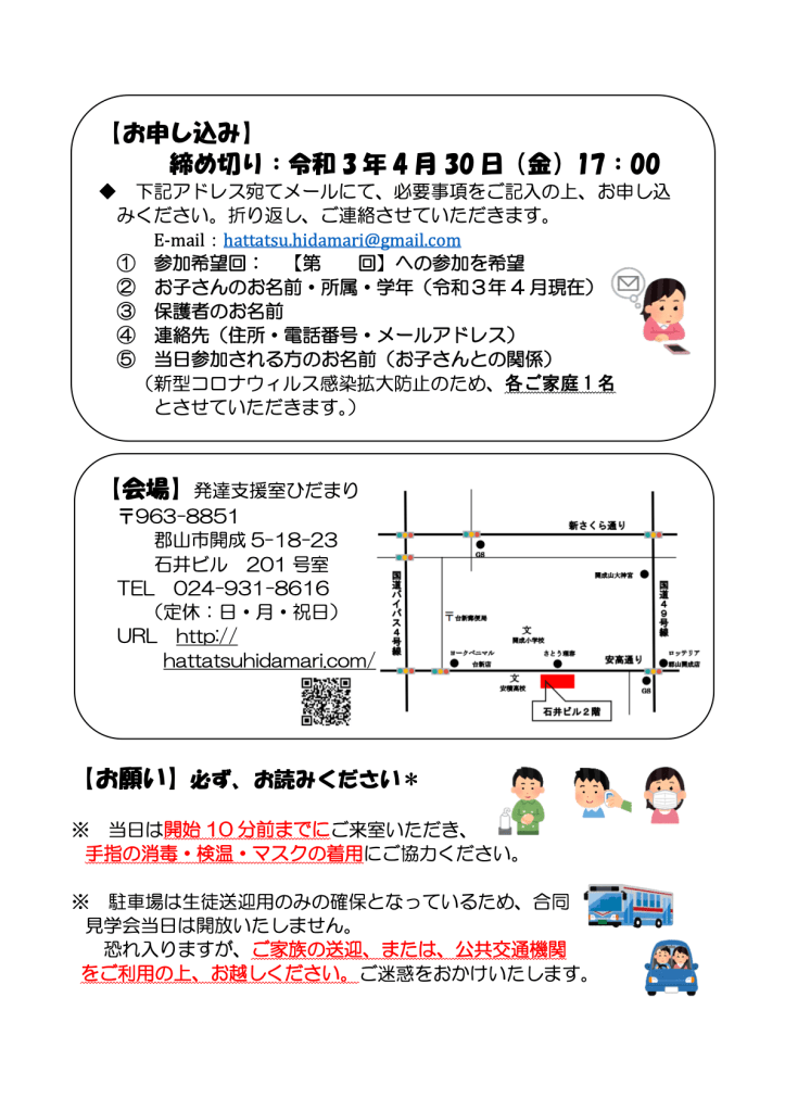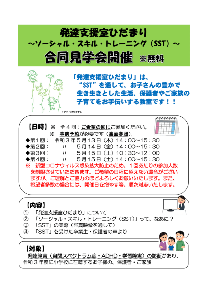 合同見学会開催のお知らせ 投稿者:shinobusaitohidamari2021年4月3日カテゴリー:未分類 発達支援室ひだまりの合同見学会を開催いたします。 開催期間 令和3年5月13日(木)〜15日(土) 詳細につきましては添付資料をご覧ください。 共有: クリックして X で共有 (新しいウィンドウで開きます) X Facebook で共有するにはクリックしてください (新しいウィンドウで開きます) Facebook いいね 読み込み中… 関連